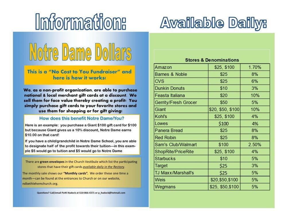 Daily Sales of Notre Dame Dollar Gift Cards in the Rectory, 9AM - 3PM. If that time doesn't work for you, please call 610-866-4371 or email p_hudock@hotmail.com and we will make other arrangements for you.